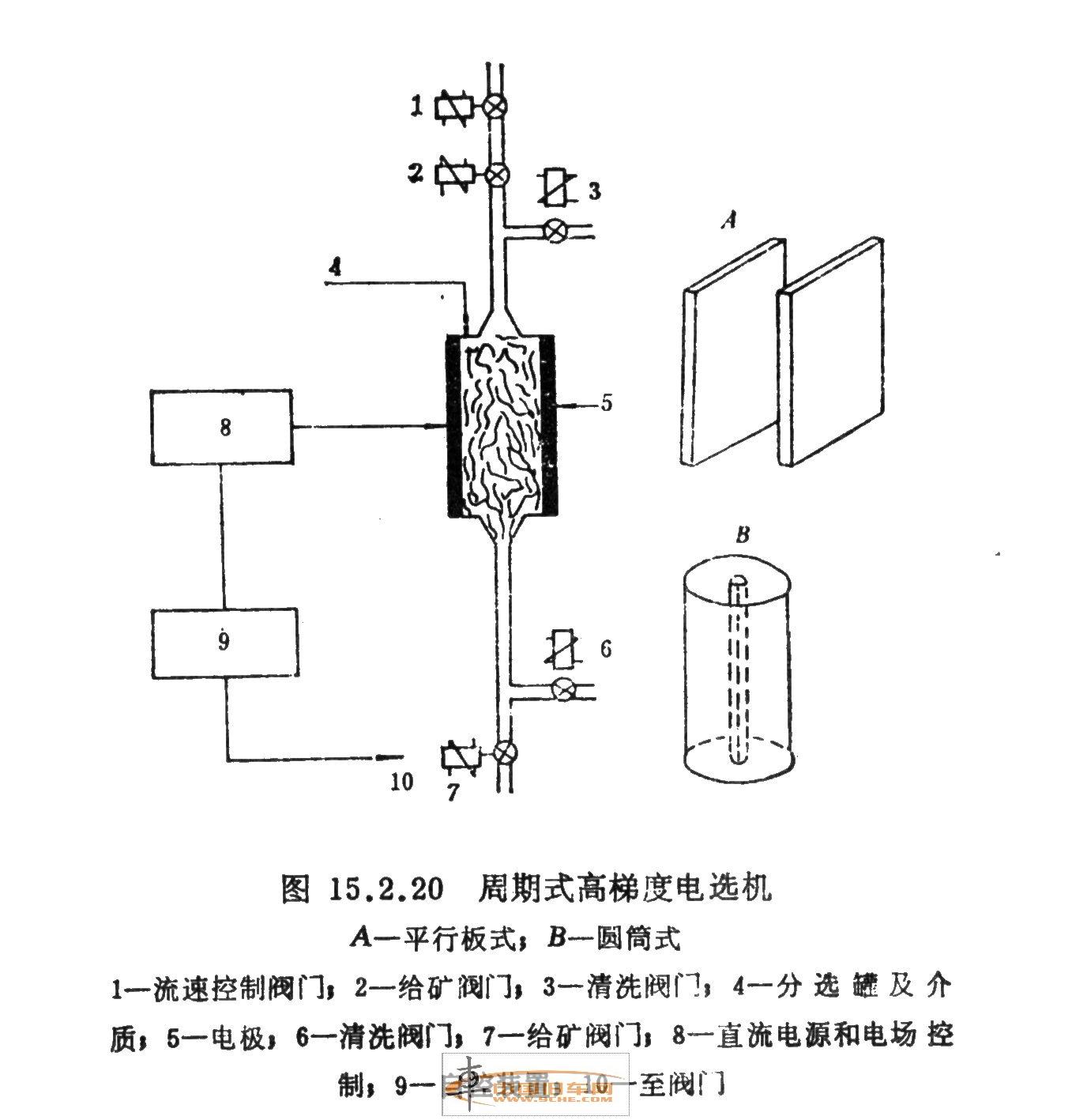 圖3為周期式高梯度電選機的簡圖。它是實驗室型裝置,用于分離固體和過濾非導(dǎo)電的液體。該裝置的基本部分是大量的細纖維介質(zhì),可以是各種纖維和篩網(wǎng)。