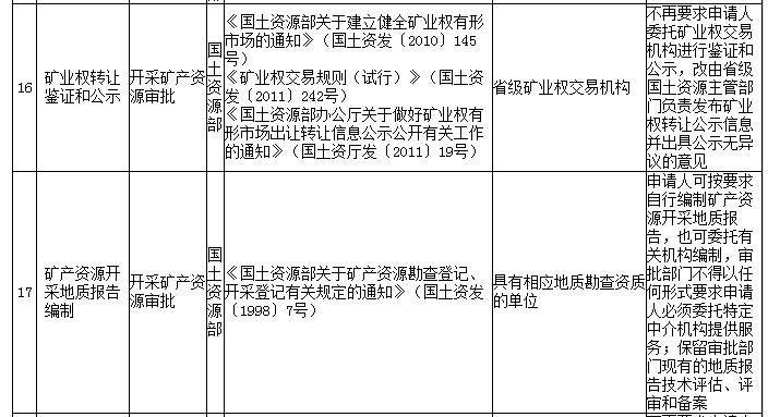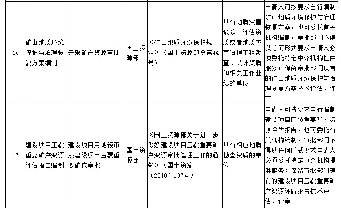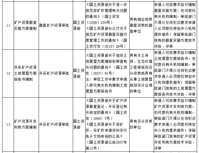 此前,國務院于2015年10月11日發(fā)布的《國務院關于第一批清理規(guī)范89項國務院部門行政審批中介服務事項的決定》(國發(fā)[2015]58號),明確取消了礦業(yè)權轉(zhuǎn)讓鑒證和公示、采礦權申請范圍核查、礦產(chǎn)資源勘查實施方案編制、開采礦產(chǎn)資源土地復墾方案報告書編制、礦產(chǎn)資源開發(fā)利用方案編制、礦產(chǎn)資源儲量核實報告編制、礦山儲量年報編制、礦山地質(zhì)環(huán)境保護與恢復治理方案編制、建設項目壓覆重要礦產(chǎn)資源評估報告編制等9項資質(zhì)要求。