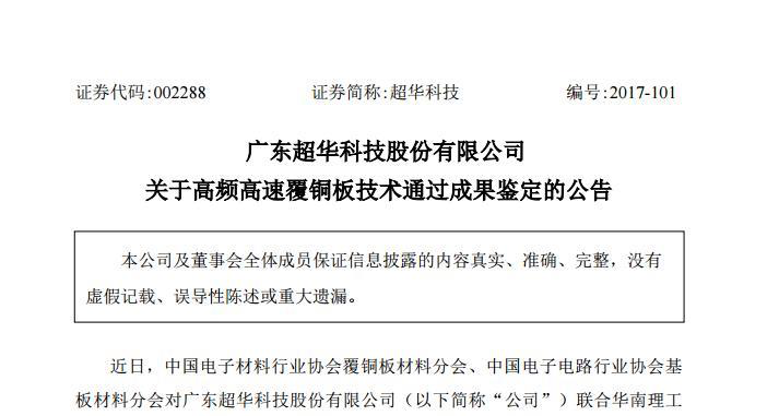 公告稱,高頻高速覆銅板技術是超華科技堅持實施“市場驅(qū)動+技術創(chuàng)新”產(chǎn)品戰(zhàn)略的重要成果。本項技術成果的取得標志著超華科技高端覆銅板技術水平邁入了新的臺階,將為超華科技2017年非公開發(fā)行股票募投項目之一——“年產(chǎn)600萬張高端芯板項目”的實施和相關技術成果的產(chǎn)業(yè)化奠定堅實基礎,并將對夯實電子基材主業(yè),完善產(chǎn)品結構,提升產(chǎn)品競爭力具有重要意義。