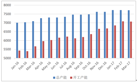 2016年中國氧化鋁產(chǎn)量為6099萬噸,占全球總產(chǎn)量的53%。截至2017年3月,全國總產(chǎn)能為7713萬噸,同比增長8.73%,開工產(chǎn)能7071萬噸,同比增長24.71%。2017年3月份產(chǎn)量為603萬噸,同比增長25.12%,1-3月份增長1724萬噸,同比增長25.73%。