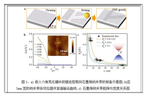 研究人員首先通過金屬納米顆??涛g六角氮化硼單晶襯底,切割出單原子層厚度、邊緣平直且沿鋸齒型(Zigzag)方向、寬度具有一定可控性的納米溝槽,然后通過化學氣相沉積法在溝槽中制備出長度達到數微米且寬度小于10納米的高質量石墨烯納米帶。