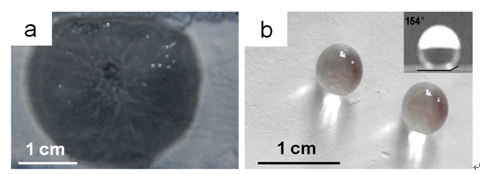 圖1 傳統(tǒng)涂料(a)和自清潔涂料(b)表面的水滴形態(tài)