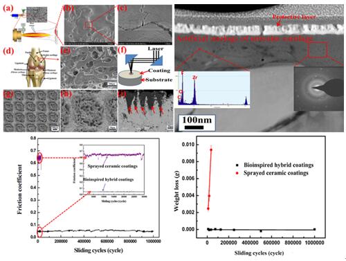 在此研究基礎(chǔ)上,為了獲得具有超長壽命、低摩擦系數(shù)和磨損性能的陶瓷基復(fù)合涂層材料,受骨松質(zhì)結(jié)構(gòu)和關(guān)節(jié)軟骨營養(yǎng)機(jī)制的啟發(fā),研究人員利用熱噴涂工藝制備出了一種具有優(yōu)異摩擦學(xué)性能的仿生智能涂層。該涂層在較大范圍內(nèi)的摩擦速率和載荷變化下,可保持低的摩擦系數(shù),其在高載荷下(1.4GPa)的摩擦系數(shù)為<0.065,并且具有優(yōu)異的摩擦壽命(> 1×106 轉(zhuǎn))。在超長時間的摩擦測試過程中,該涂層不僅自身展現(xiàn)出近零磨損的特性,而且對對偶材料的損傷極其輕微,這種優(yōu)異的摩擦學(xué)性能得益于該陶瓷復(fù)合涂層以摩擦熱和壓力為驅(qū)動力和修復(fù)力,在摩擦表面形成了可不斷修復(fù)的類“軟骨層”。