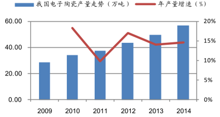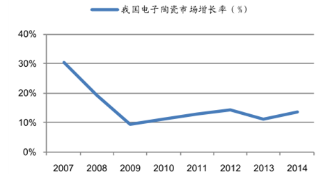 在我國,電子陶瓷為政策指導(dǎo)下新一代信息技術(shù)產(chǎn)業(yè)中重點發(fā)展的關(guān)鍵戰(zhàn)略材料之一,呈現(xiàn)出迅猛發(fā)展勢頭,2007年我國電子陶瓷行業(yè)市場增長率為30.4%,除去金融危機(jī)的影響,近年行業(yè)增速維持在11%以上的水平,行業(yè)產(chǎn)量年均增速接近15%。