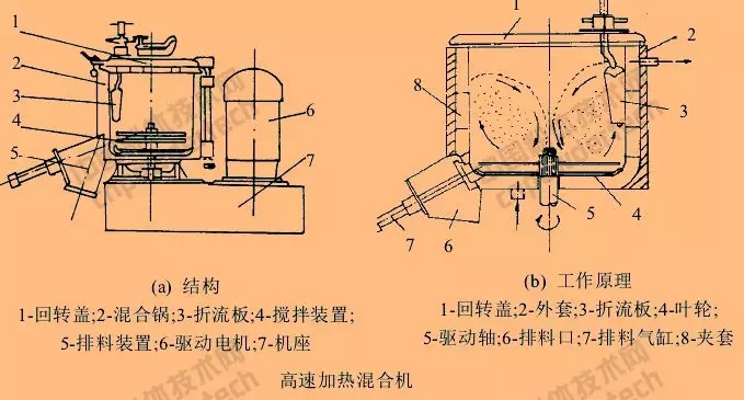 高速加熱式混合機(jī)主要由回轉(zhuǎn)蓋、混合鍋、折流板、攪拌裝置、排料裝置、驅(qū)動(dòng)電機(jī)、機(jī)座等組成。