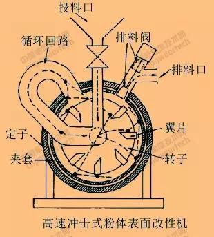 同時(shí)轉(zhuǎn)子的高速旋轉(zhuǎn)強(qiáng)制粉體物料松散并形成渦流二相流,使表面改性劑能迅速、均勻地與粉體顆粒表面作用,包覆于顆粒表面。