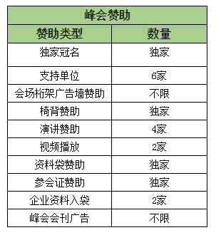 演講贊助可獲得:大會(huì)背景板、會(huì)議報(bào)道中顯示LOGO;9㎡標(biāo)準(zhǔn)展位;展會(huì)刊內(nèi)頁廣告、峰會(huì)會(huì)刊內(nèi)頁彩頁廣告以及2個(gè)免費(fèi)參會(huì)名額、會(huì)議午餐、茶歇服務(wù)等。