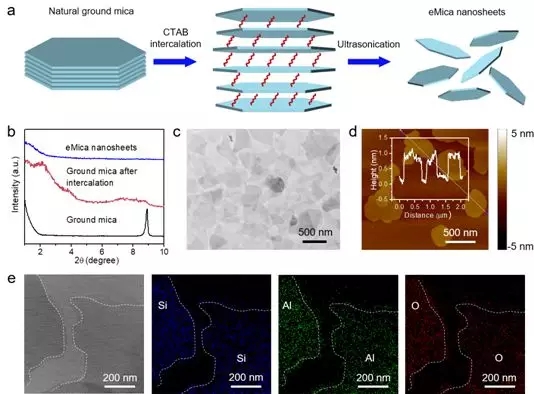 (a)云母納米片制備策略;(b)云母粉、插層云母和云母納米片的小角度XRD;(c)云母納米片的TEM圖像;(d)云母納米片的AFM圖像;(e)云母納米片的TEM-mapping圖像。