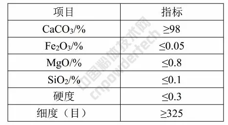 該工藝的原料為325目普通鈣粉,指標(biāo)要求如下表。原料礦粉的驗(yàn)收指標(biāo)必須合格,否則不但成品漿料的細(xì)度、粘度達(dá)不到設(shè)計(jì)標(biāo)準(zhǔn),如果二氧化硅含量過高還會導(dǎo)致設(shè)備過快的磨損,縮短設(shè)備的使用壽命,而且會對產(chǎn)品的白度和在塑料工業(yè)里的應(yīng)用產(chǎn)生極大的影響。