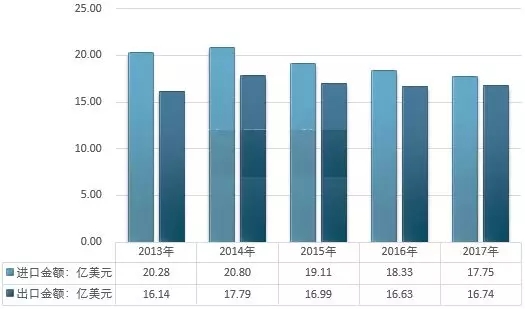 ▲圖4 2013-2017年全球高嶺土及類似土(HS:250700)進(jìn)出口貿(mào)易總額走勢圖(單位:億元)