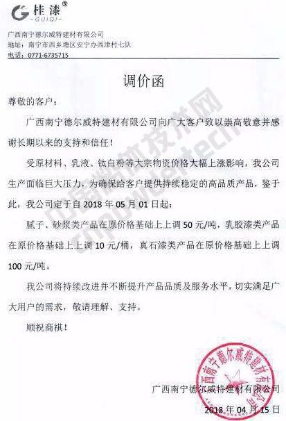 近日,廣西地區(qū)100多家涂料企業(yè)集體發(fā)布漲價函:從5月1日起,所有膩子類、砂漿類產品在原出廠價格的基礎上上調50元/噸。
