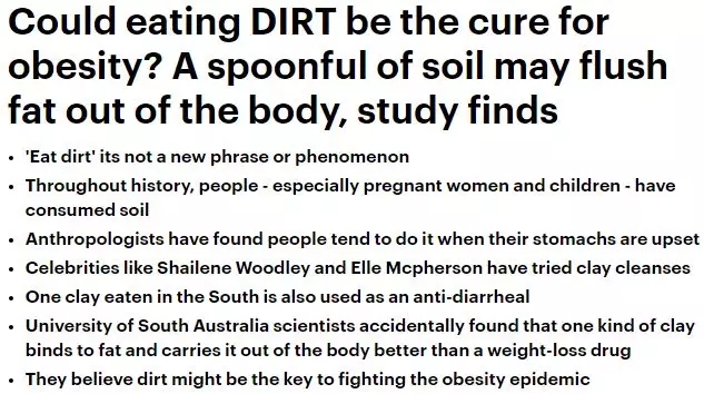 博士候選人丹寧(Tahnee Dening)和其他研究人員發(fā)現(xiàn):一項新的研究顯示吃蒙脫石土的老鼠,比服用減肥藥的老鼠減肥效果還要好,顯示吃土對減肥是有幫助的。
