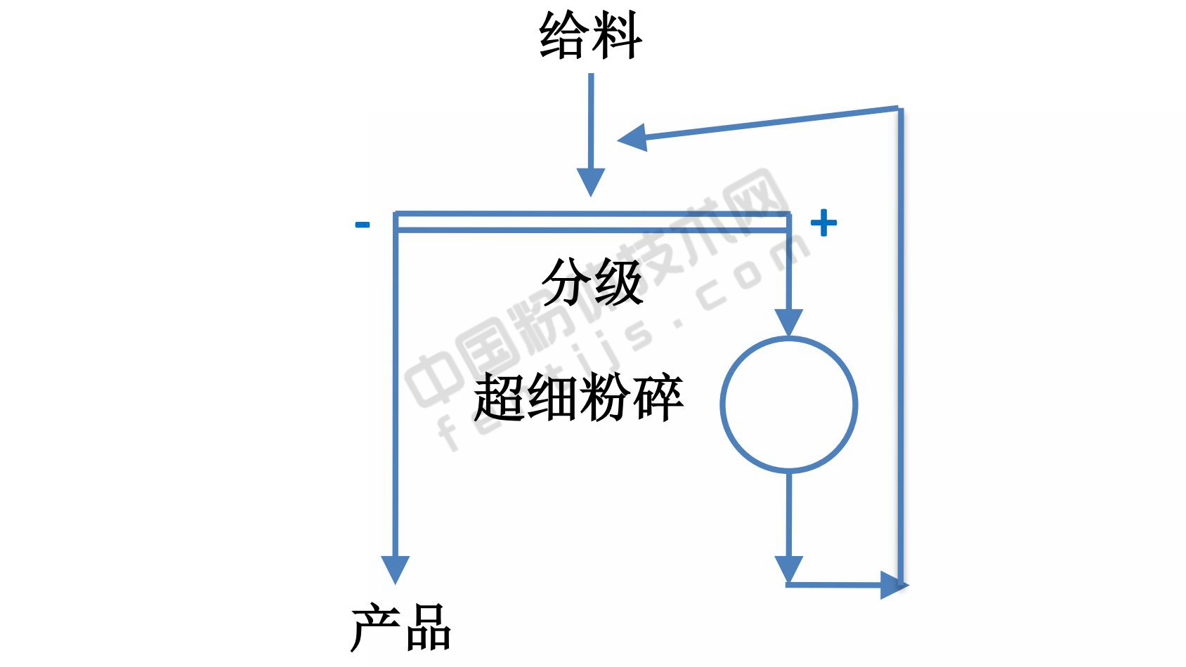 其特點(diǎn)是物料在進(jìn)入超細(xì)粉碎機(jī)之前先經(jīng)分級(jí),細(xì)粒級(jí)物料直接作為超細(xì)粉體產(chǎn)品。粗粒級(jí)物料再進(jìn)入超細(xì)粉碎機(jī)粉碎。當(dāng)給料中含有較多的合格粒級(jí)超細(xì)粉體時(shí),采用這種工藝流程可以減輕粉碎機(jī)的負(fù)荷,降低單位超細(xì)粉產(chǎn)品的能耗。提高作業(yè)效率。