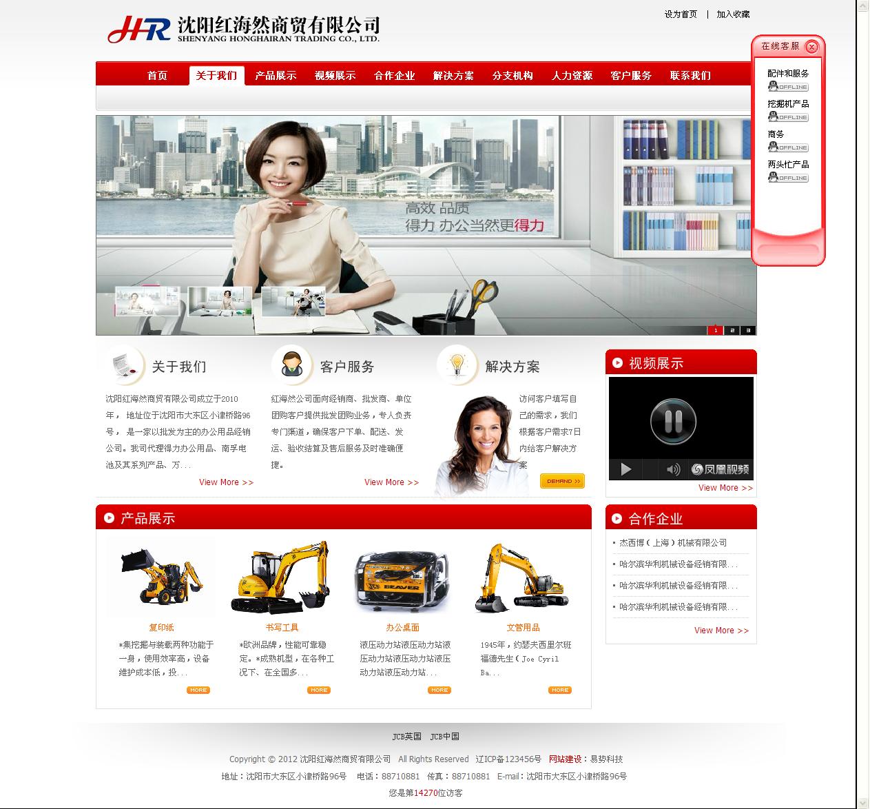 網(wǎng)站簡(jiǎn)介: 沈陽紅海然商貿(mào)有限公司成立于2010年,是一家以批發(fā)為主的辦公用品經(jīng)銷公司。公司代理得力辦公用品、南孚電池及其系列產(chǎn)品、萬涵復(fù)印紙、奇豐電池、飛科小家電產(chǎn)品,銷售覆蓋東北三省。沈陽紅海然商貿(mào)有限公司的網(wǎng)站主要分為9個(gè)板塊、16個(gè)欄目,支持視頻展示、產(chǎn)品展示、在線QQ咨詢等功能,企業(yè)可以通過人力資源欄目進(jìn)行招聘工作,另外用戶可以通過解決方案這個(gè)欄目進(jìn)行留言提問,方便了同用戶的溝通交流。