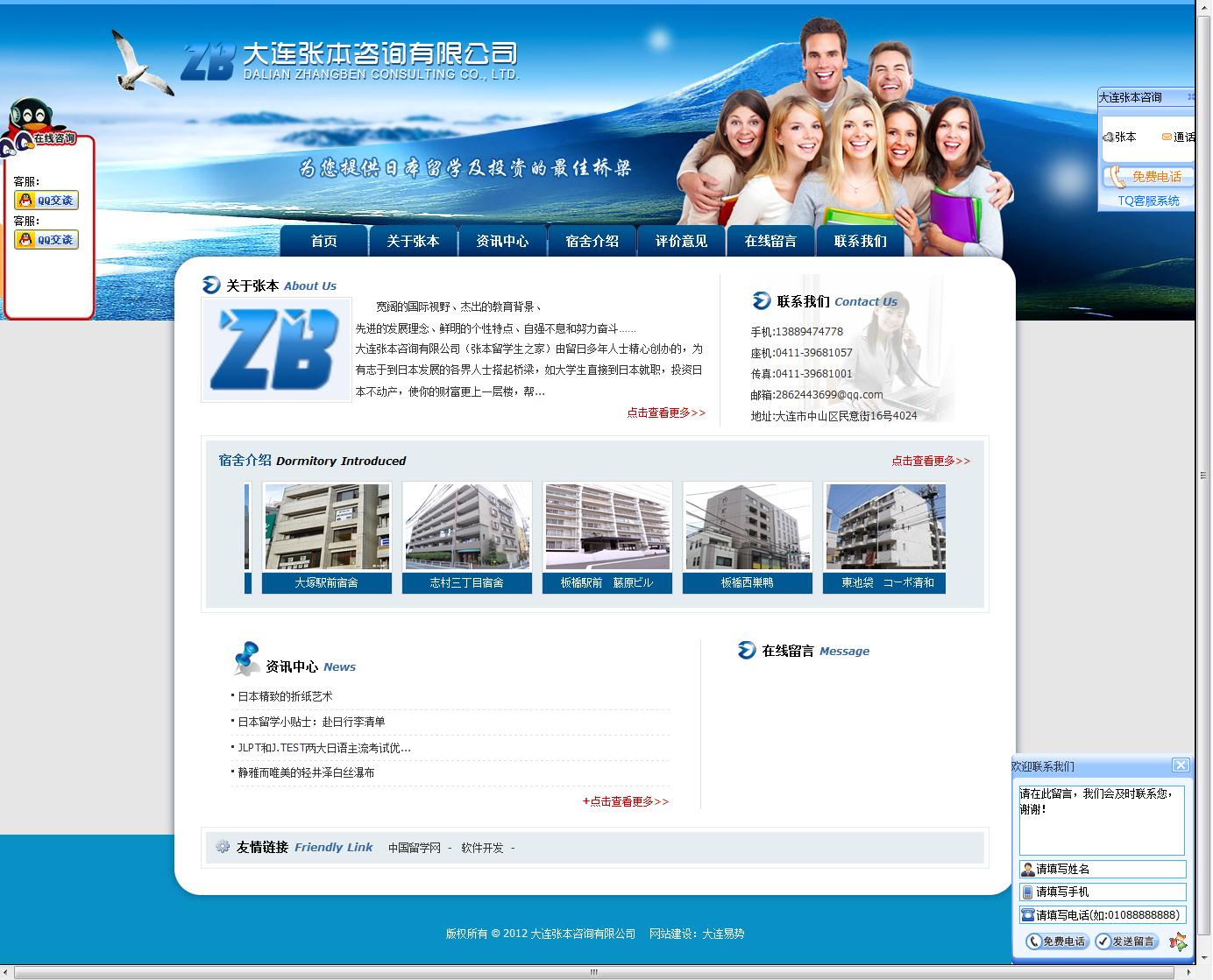 網站簡介: 大連張本咨詢有限公司是由留日多年人士精心創(chuàng)辦的,為有志于到日本發(fā)展的各界人士搭起橋梁。大連張本咨詢有限公司是直接租賃或是購買了學生宿舍后讓學生使用。宿舍針對留學生的實際需求,節(jié)省了中間成本,月租金比學校推出的宿舍會更便宜,減輕了學生留日的最大生活成本,把實惠留給了學生。 可為學生提供更安心的國內外“一條龍”的優(yōu)質服務。大連張本咨詢有限公司的網站有6個板塊,支持在線QQ、在線留言、信息發(fā)布等功能。網站首頁即有浮動QQ窗口,用戶可以在線進行咨詢,同時也可通過在線留言欄目進行留言,企業(yè)會即時給予回復。如果用戶有什么意見,也可以在評價意見欄目提出意見。咨詢中心主要進行發(fā)布相關行業(yè)資訊。