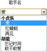 <select id="name" name="name"> <optgroup label="小虎隊(duì)"><option value="ai">愛</option> <option value="hqt">紅蜻蜓</option> <option value="zj">再見</option> </optgroup> <optgroup label="胡歌"> <option value="wjsj">忘記時(shí)間</option> <option value="gbga">敢不敢愛</option> </select></optgroup>