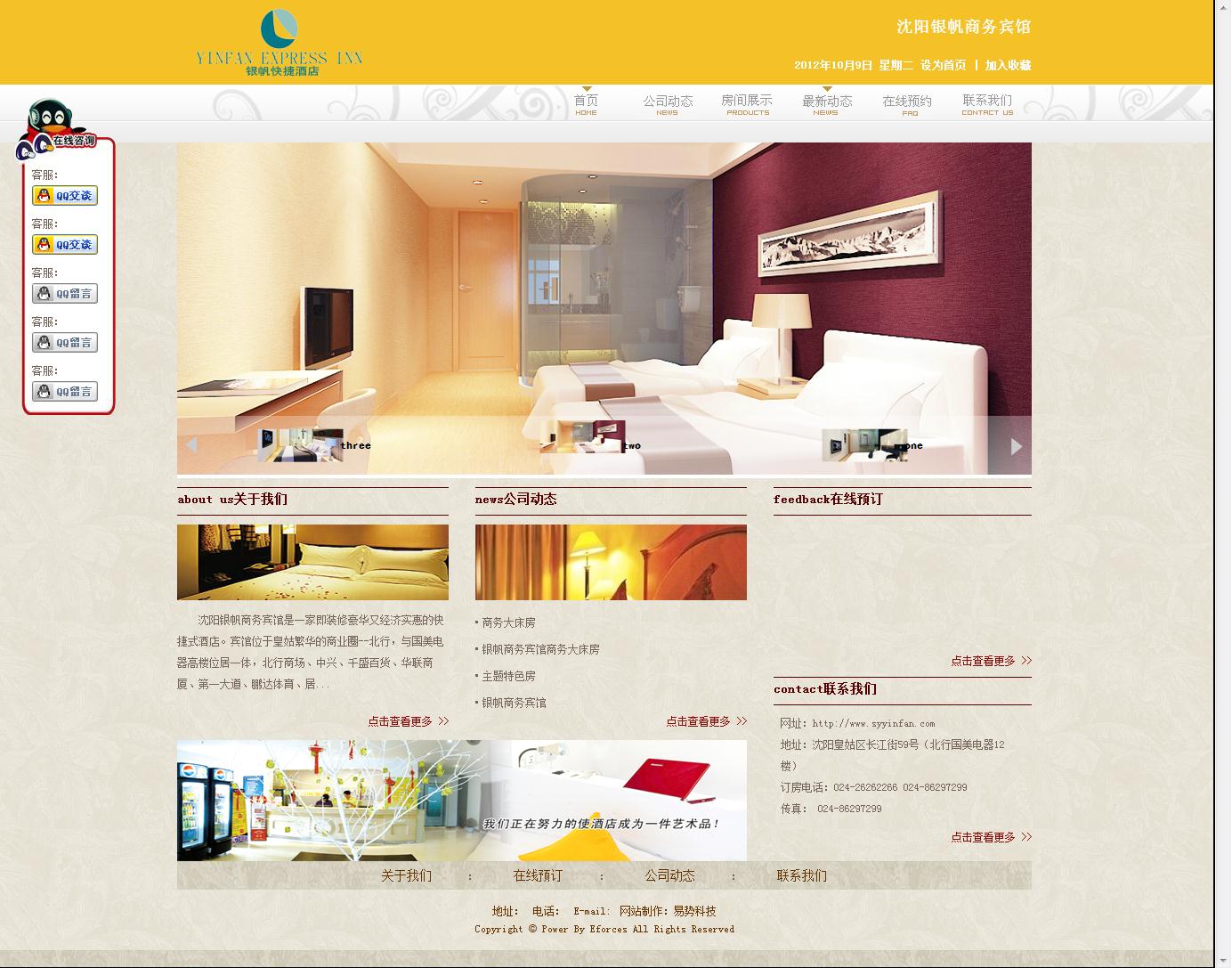 網(wǎng)站簡(jiǎn)介: 沈陽銀帆商務(wù)賓館是一家既裝修豪華又經(jīng)濟(jì)實(shí)惠的快捷式酒店。賓館設(shè)施星級(jí)標(biāo)準(zhǔn),24小時(shí)提供大噴頭淋浴、獨(dú)立空調(diào)、地?zé)嵩O(shè)施,免費(fèi)寬帶上網(wǎng),2米純皮大床舒適安歇,讓你流連忘返。賓館的價(jià)格經(jīng)濟(jì)實(shí)惠,為您提供尊貴的待遇,享受不一樣的感覺。沈陽銀帆商務(wù)賓館的網(wǎng)站主要有5個(gè)板塊,支持在線咨詢、在線預(yù)約、信息發(fā)布等功能。網(wǎng)站首頁即有在線咨詢浮動(dòng)窗口,用戶可以通過QQ同企業(yè)取得聯(lián)系,進(jìn)行溝通交流。企業(yè)主要通過行業(yè)新聞欄目更新該行業(yè)最新資訊,而房間展示板塊主要通過圖片展示了各種等級(jí)的房間,使瀏覽網(wǎng)站的用戶可以對(duì)賓館的設(shè)施、條件有所了解。網(wǎng)站還提供在線預(yù)訂功能,可以通過此功能進(jìn)行房間預(yù)訂,企業(yè)會(huì)與您取得聯(lián)系給您預(yù)留房間。