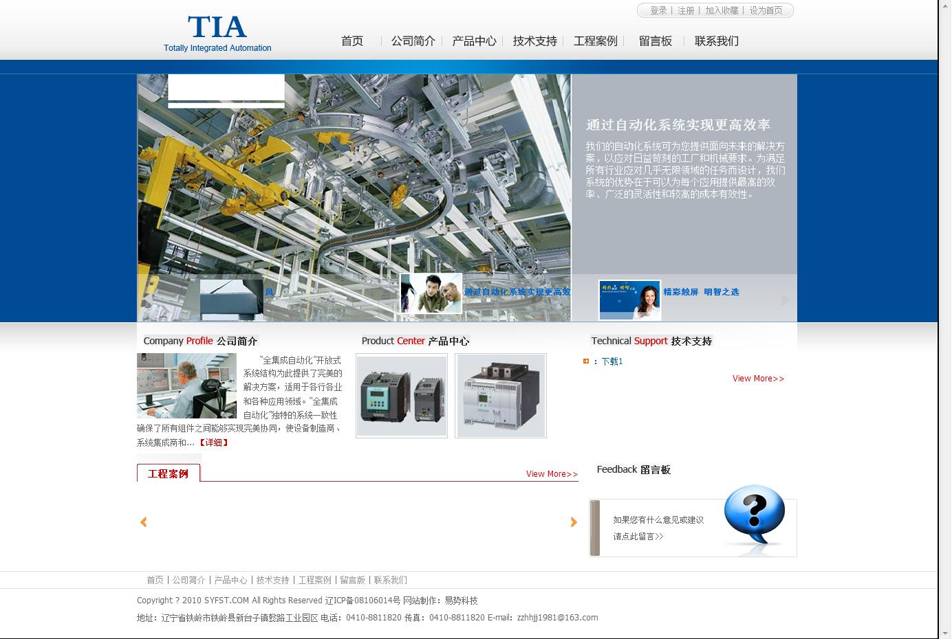 網(wǎng)站簡介: “全集成自動化”獨特的系統(tǒng)一致性確保了所有組件之間能夠?qū)崿F(xiàn)完美協(xié)同,使設(shè)備制造商、系統(tǒng)集成商和終端客戶都能夠從中受益:優(yōu)化的流程降低了總擁有成本,縮短了產(chǎn)品上市時間,提高了產(chǎn)品質(zhì)量。沈陽全集成自動化電氣有限公司的網(wǎng)站主要有6個板塊,支持信息發(fā)布、案例展示、留言板等功能。企業(yè)主要通過圖片展示公司產(chǎn)品,讓瀏覽網(wǎng)站的用戶對抽象的概念有了具體的認識。而工程案例板塊展示了企業(yè)的成功案例。同時,用戶在瀏覽網(wǎng)站的過程中如果遇到任何問題,都可以通過留言板板塊同企業(yè)取得聯(lián)系,企業(yè)的客服也會盡快給予回復(fù),方便了用戶同企業(yè)之間的溝通聯(lián)系。