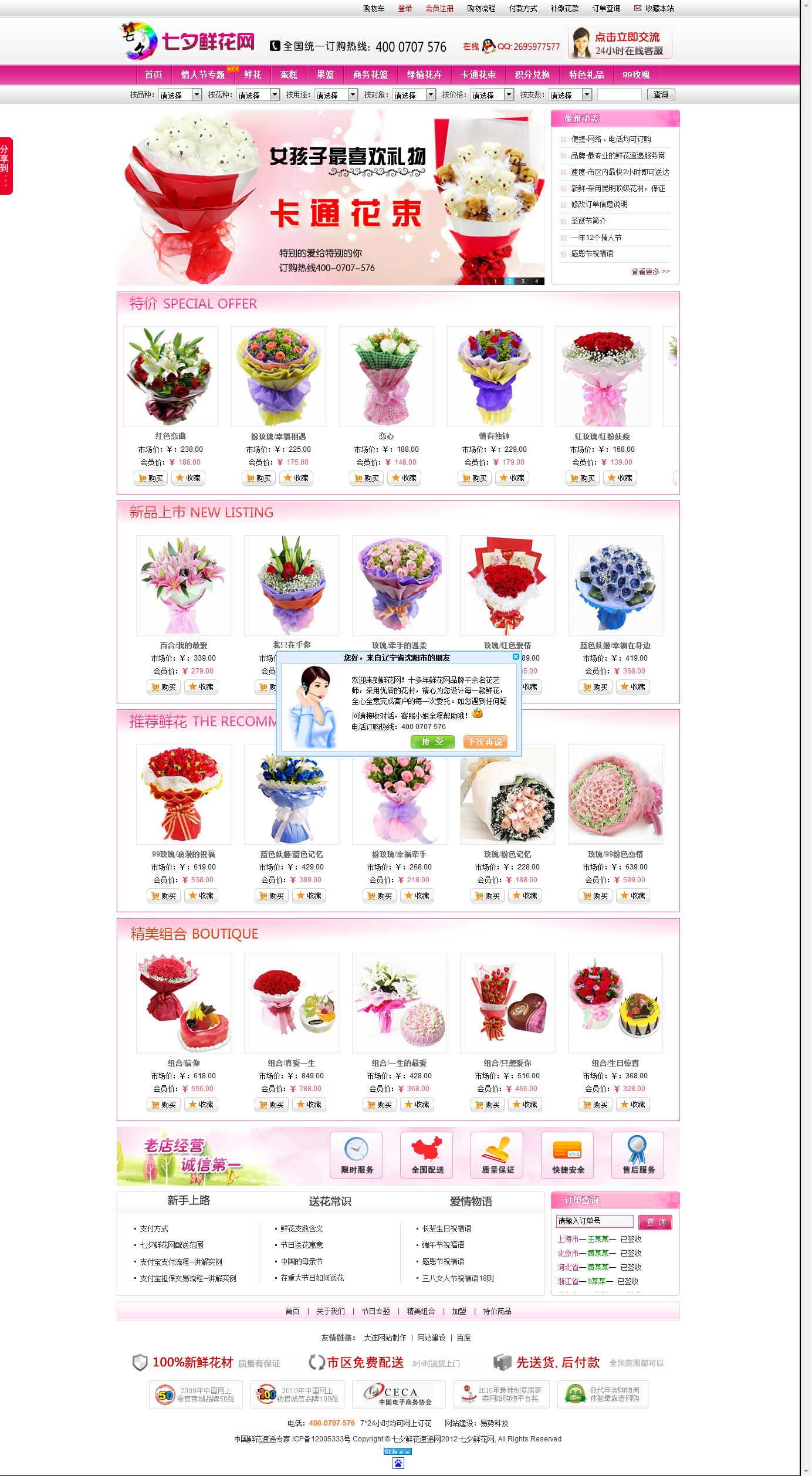 網(wǎng)站簡介: 七夕鮮花網(wǎng)是服務(wù)于中國及全球領(lǐng)先在線鮮花、蛋糕服務(wù)的提供商,網(wǎng)絡(luò)遍布世界各地。七夕鮮花網(wǎng)可提供定點(diǎn)定時(shí)送貨上門服務(wù),以最高的效率、最優(yōu)質(zhì)的服務(wù)、最有保證的品質(zhì),為客戶提供最高效便捷的服務(wù)。七夕鮮花網(wǎng)支持在線訂購、在線咨詢、產(chǎn)品展示等功能。網(wǎng)站首頁有特價(jià)鮮花以圖片跑馬燈的方式進(jìn)行展示,也有新品和網(wǎng)站推薦的鮮花展示,瀏覽網(wǎng)站的用戶可以通過這些來選擇購買鮮花。網(wǎng)站提供會員注冊功能,瀏覽網(wǎng)站的用戶通過注冊會員,購買鮮花時(shí)即可享受比市場價(jià)稍低的會員價(jià),節(jié)省了金錢。在瀏覽網(wǎng)站的過程中,如果遇到任何問題,可以通過在線客服進(jìn)行咨詢,企業(yè)的客服會幫助您解決問題,方便了企業(yè)同用戶之間的溝通和聯(lián)系。