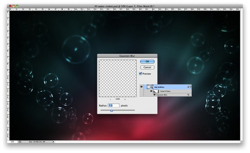 圖09 步驟10 選擇泡沫層,去濾鏡>轉(zhuǎn)換為智能濾鏡,然后去濾鏡>模糊>高斯模糊。使用7像素的半徑。整個(gè)圖層會(huì)很模糊,圖層面板上白色的略縮圖就是所謂的智能濾鏡。選擇畫筆工具(B),使用黑色描繪你不希望泡沫模糊的地方。這就像是一個(gè)智能濾鏡的蒙板。