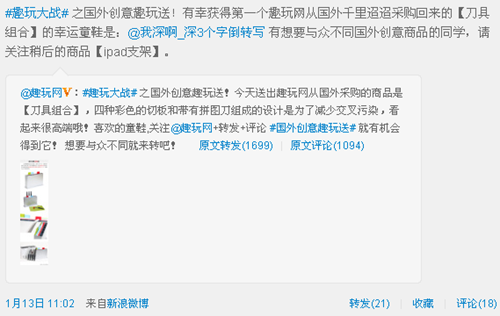 在活動上同樣如此,微博和其他網(wǎng)站上都流行送iPad或iPhone4的活動,不可否認(rèn)效果極佳,但和上面一樣,這些用戶對網(wǎng)站來說含金量太低,因此趣玩網(wǎng)前期活動以送網(wǎng)站新品為主,一舉四得就不再次重復(fù)了。后期也是送國外創(chuàng)意產(chǎn)品,除了效果更佳外,還有進(jìn)行前期市場調(diào)查的作用,通過反響來決定是否引進(jìn)。