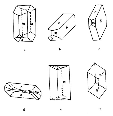 長石晶形有單斜晶系和三斜晶系兩種。常見的長石結(jié)晶形態(tài)如圖2所示。