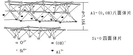 高嶺石的化學(xué)式為Al4〔Si4O10〕(OH)8,其理論化學(xué)成分為:Al2O3 39.5%、SiO2 46.54%、H2O 13.96%。高嶺石屬1:1層型的二八面體層狀鋁硅酸鹽礦物,其結(jié)構(gòu)單元層由一層硅氧四面體和一層鋁氧八面體組成(見圖1),結(jié)構(gòu)單元層厚度d(001)=0.715nm,單斜或三斜晶系。由于堆疊中結(jié)構(gòu)單元層間的位移,便構(gòu)成了不同的多型。高嶺石是一層重復(fù)的多型,兩層重復(fù)和六層重復(fù)的多型分別稱為地開石和珍珠石。結(jié)晶良好的高嶺石為有序結(jié)構(gòu),一般呈假六方片狀晶體。結(jié)晶度差的多為b軸無序的高嶺石,一般呈不規(guī)則片狀。