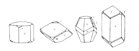 菱鎂礦石中的主要化學(xué)成分為MgCO3,次要成分為CaO、SiO2、Fe2O3、Al2O3。MgO的含量一般為35~47%,CaO 0.2~4%,SiO2 0.2~8%,F(xiàn)e2O3和Al2O3的含量一般在1%以下。菱鎂礦屬于三方晶系, ;菱面體晶胞:arh=0.566nm,α=48010′;Z=2;六方晶胞:ah=0.462nm,ch=1.499nm;Z=6。方解石型結(jié)構(gòu)。復(fù)三方偏三角面體晶類, 。晶體常見單形:菱面體 ,六方柱 ,平行雙面 ,復(fù)三方偏三角面體 (圖1)。常呈顯晶粒狀或隱晶質(zhì)致密塊體。在風(fēng)化帶常呈隱晶質(zhì)瓷狀。