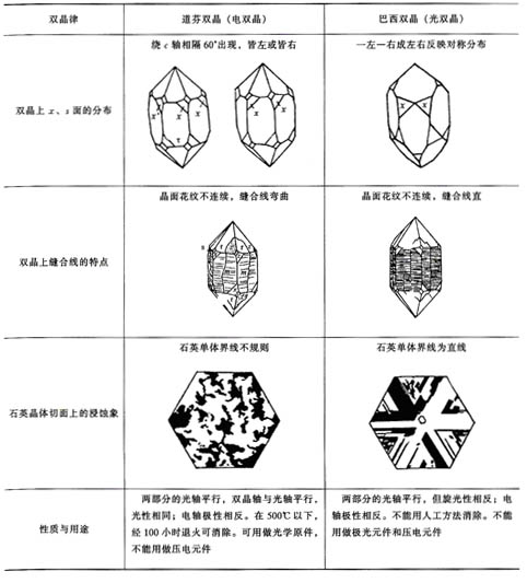 雙晶十分普遍,常見(jiàn)的重要雙晶律有道芬雙晶和巴西雙晶。道芬雙晶由兩個(gè)左形或右形晶體組成,兩個(gè)體的偏光面向同一方向旋轉(zhuǎn),因而仍可作光學(xué)材料。巴西雙晶由一個(gè)左形和一個(gè)右形組成,在(0001)切片中由于兩個(gè)體的偏光面相反,且有不同的干涉色,故不適合作為光學(xué)材料。下圖為石英常見(jiàn)雙晶表。
