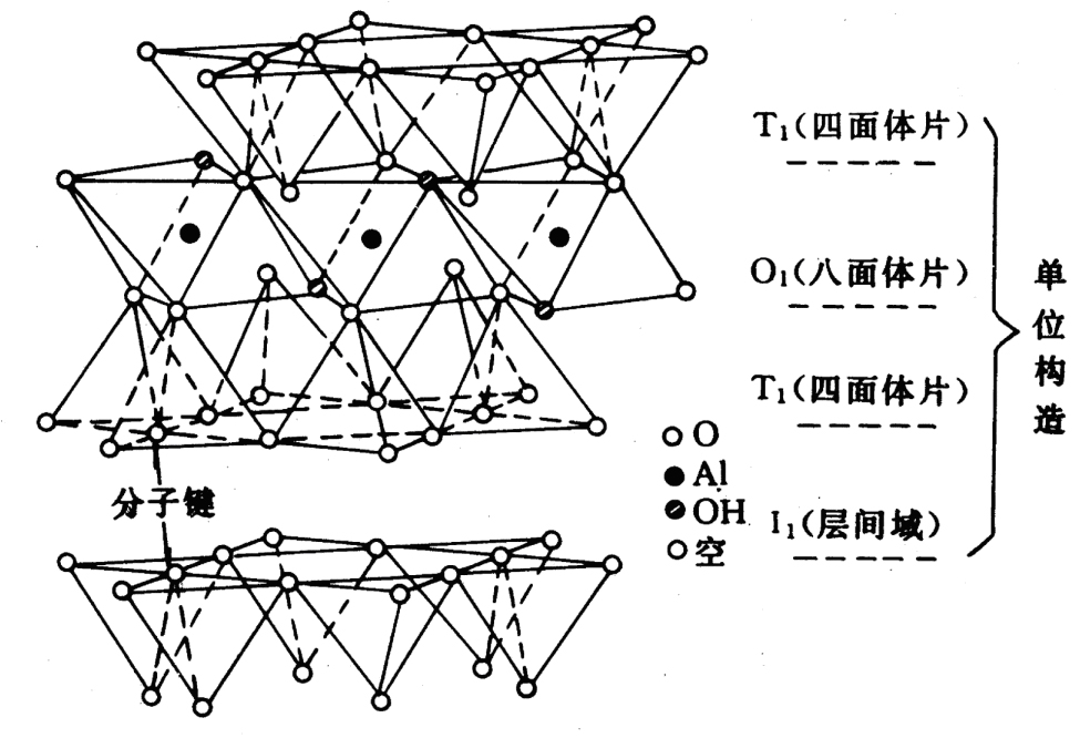 =2:1。硅氧四面體層中的四面體排列也不是理想的正六方網(wǎng)狀。相鄰四面體彼此反向旋轉(zhuǎn)約10°,發(fā)生畸變。使四面體層在b軸方向縮短,與二八面體型結(jié)構(gòu)中較小的八面體層相適應(yīng)(圖1)。