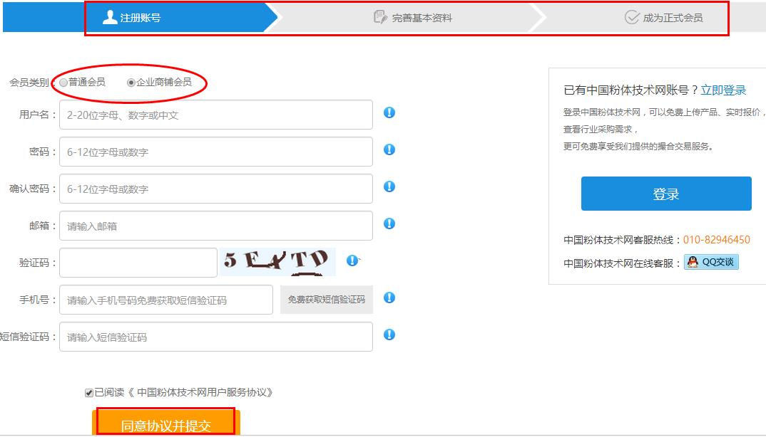 (2)進入注冊頁面,按注冊引導步驟,選擇會員類別,填寫用戶名、密碼、郵箱、手機號碼,并點擊“免費獲取短信驗證碼”,中國粉體技術網(wǎng)將向您的手機發(fā)送一條含有驗證碼的短信;在您收到短信后,將短信中的驗證碼填寫到頁面中,并同意《中國粉體技術網(wǎng)用戶服務協(xié)議》后點擊提交,即可進入下一步。