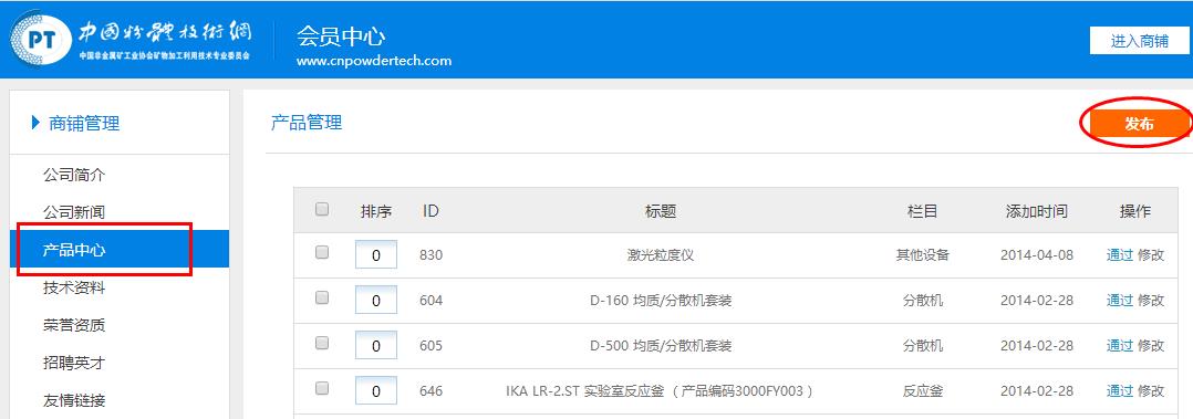 入會員中心后,點擊左側“商鋪管理-產(chǎn)品中心”進入上傳產(chǎn)品模塊。點擊右側“發(fā)布”上傳產(chǎn)品,如下圖紅框所示。