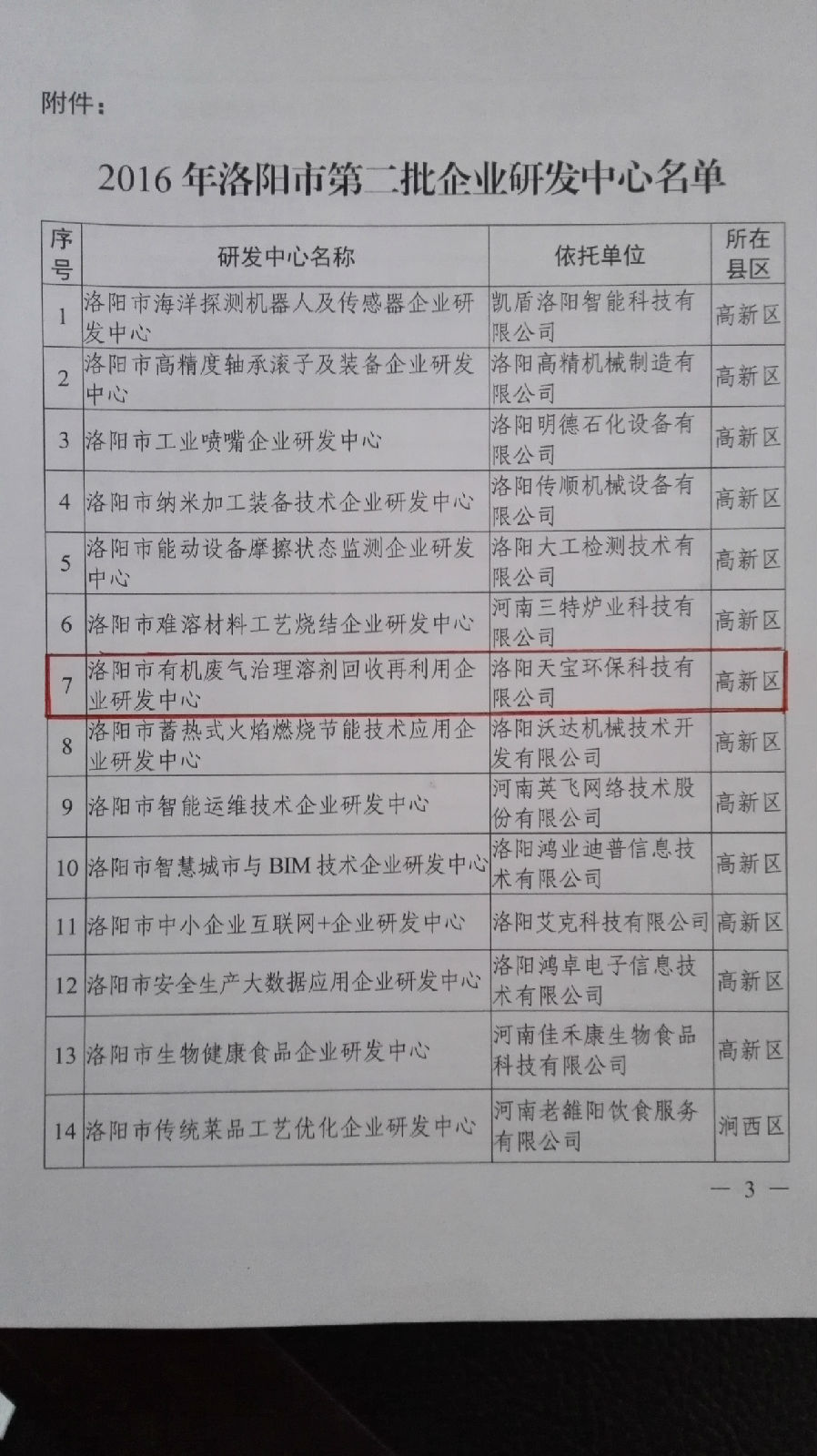 2016年8月, 公司設(shè)立的“洛陽(yáng)市有機(jī)廢氣治理溶劑回收再利用企業(yè)研發(fā)中心”獲得洛陽(yáng)市科技局認(rèn)定。(《洛陽(yáng)市科技局關(guān)于認(rèn)定2016年洛陽(yáng)市第二批企業(yè)研發(fā)中心的通知》洛市科【2016】66號(hào)文件)