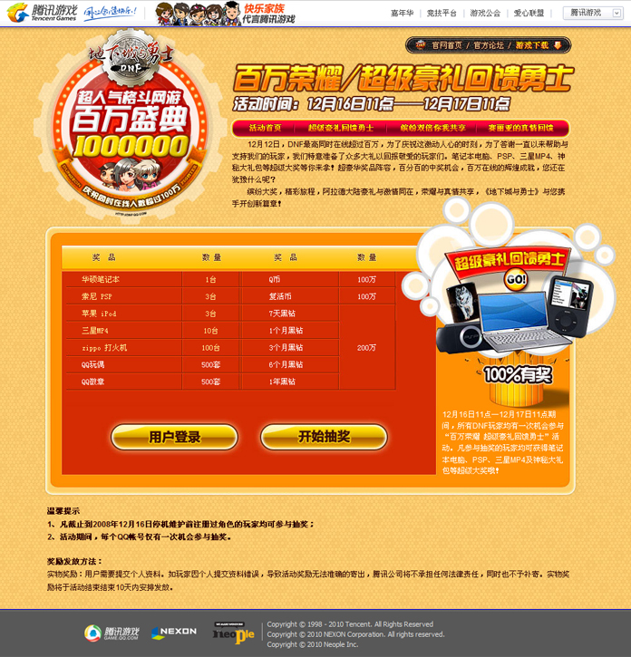 這是騰訊為游戲做的宣傳活動,網(wǎng)頁色彩艷麗、輕松活潑,從視覺上讓人感覺興奮,還沒有登錄就好像已經(jīng)中獎了一樣。